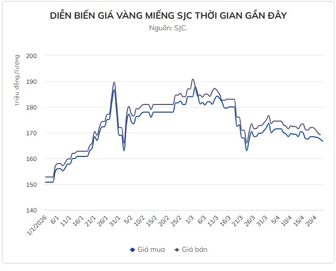 Theo thông tin từ tạp chí tri thức Znews, giá vàng trong nước ngày 23/4 tiếp tục giảm mạnh, kéo mặt bằng giá xuống sát mốc 169 triệu đồng/lượng sau chuỗi phiên đi xuống kéo dài. Diễn biến này được ghi nhận tại nhiều doanh nghiệp lớn, trong bối cảnh giá vàng thế giới suy yếu.