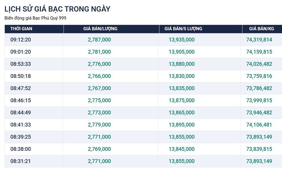 Trái ngược với sự tĩnh lặng của thị trường vàng, giá bạc trong nước hôm nay chứng kiến sự phân hóa rõ rệt. Theo biểu đồ lịch sử giá trong ngày, giá bạc đã có những nhịp điều chỉnh liên tục. Sau khi đạt đỉnh vào lúc 09:12 với mức bán ra 74.319.814 đồng/kg, giá bạc đã có xu hướng hạ nhiệt nhẹ so với các khung giờ trước đó như 08:41 (74.106.481 đồng/kg).