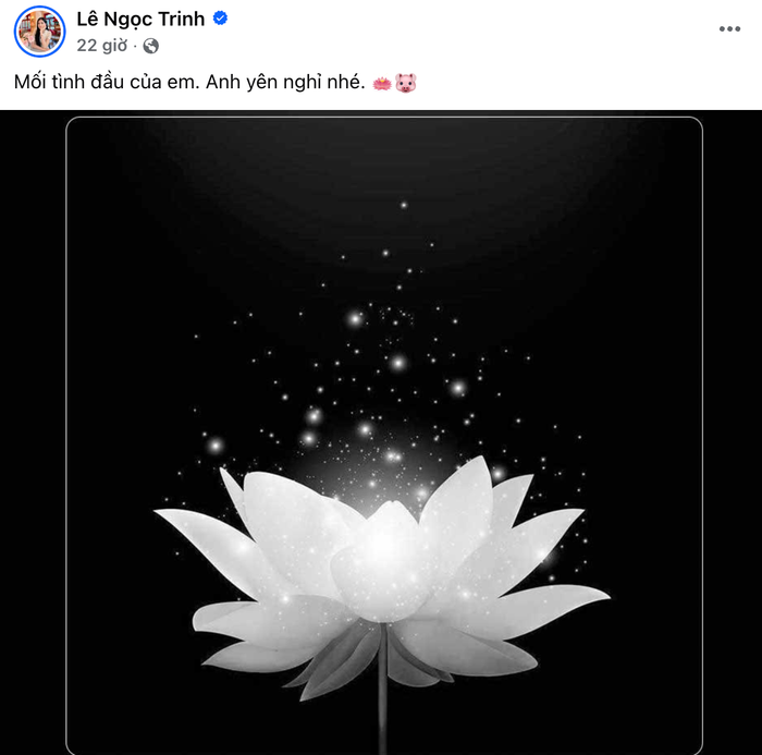 Mới đây, trên trang cá nhân, diễn viên Ngọc Trinh đã bất ngờ thông báo tin buồn khi bạn trai cũ, cũng là mối tình đầu của nữ diễn viên qua:doi. Ngọc Trinh chia sẻ ảnh hoa sen trắng đen, kèm theo dòng trạng thái đầy xót xa: "Mối tình đầu của em. Anh yên nghỉ nhé".