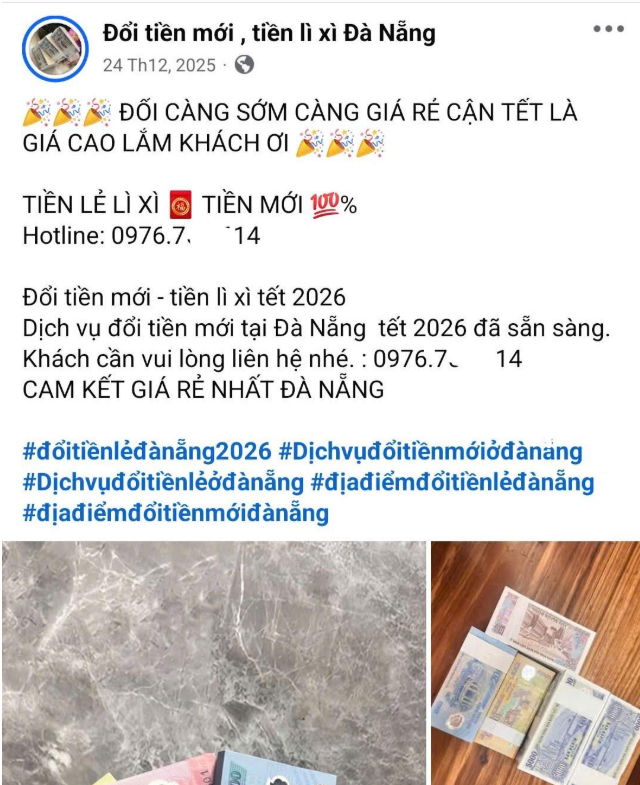 Theo Công an TP Đà Nẵng, vào thời điểm cuối năm, nhất là gần đến Tết Nguyên đán, nhu cầu đổi tiền mới, tiền lẻ để mừng tuổi, đi lễ hội đầu năm tăng cao. Lợi dụng điều này, các đối tượng xấu thường xuyên sử dụng các tài khoản mạng xã hội đăng tải các bài viết đổi tiền mới, tiền lẻ với lệ phí thấp nhưng thực chất nhằm lừa đảo chiếm đoạt tài sản của người dân.