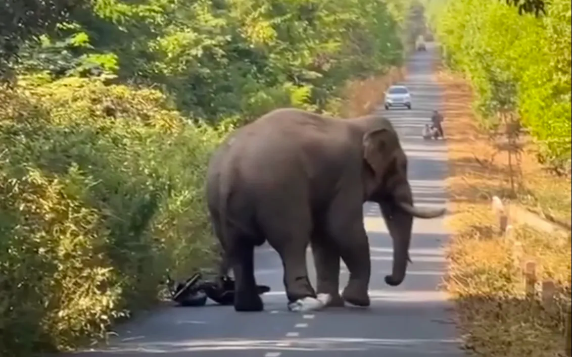 Trong lúc lưu thông trên đường, một người đàn ông đi xe máy bất ngờ chạm mặt con voi. Quá hoảng sợ, người này vội vàng bỏ lại xe máy ven đường rồi chạy nhanh để đảm bảo an toàn. Con voi sau đó tiếp tục di chuyển, không tấn công người hay gây thiệt hại tài sản.