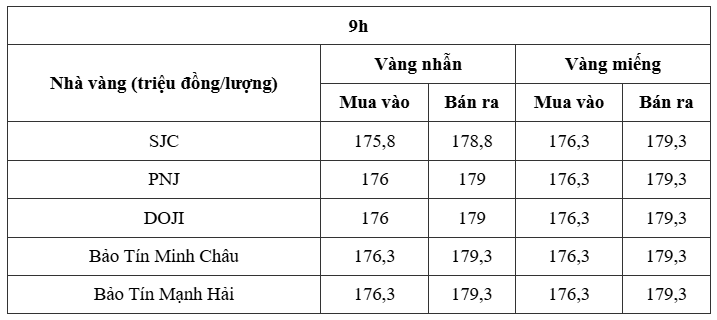 Cụ thể, vàng miếng tại SJC, PNJ, DOJI, Bảo Tín Minh Châu và Bảo Tín Mạnh Hải đồng loạt được niêm yết ở mức mua - bán là 176,3 – 179,3 triệu đồng/lượng, tăng 2,8 triệu đồng/lượng ở cả hai chiều so với cuối phiên trước.