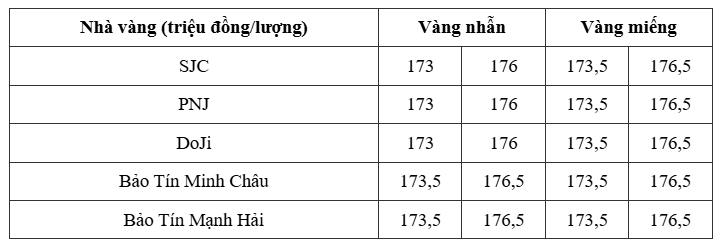 Ở phân khúc vàng nhẫn, SJC, PNJ và DOJI duy trì mức 173 – 176 triệu đồng/lượng, trong khi Bảo Tín Minh Châu và Bảo Tín Mạnh Hải chào giá cao hơn, 173,5 – 176,5 triệu đồng/lượng.