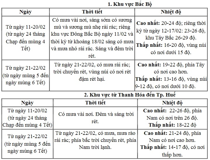 Phía Bắc khu vực từ Thanh Hoá đến Huế mưa vài nơi; phía Nam có mưa, mưa vừa, có nơi mưa to trong ngày 9/2, sau có mưa, mưa rào rải rác, từ 10/2, mưa vài nơi. Trời rét.
