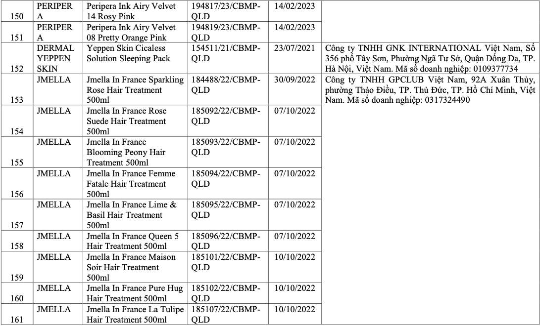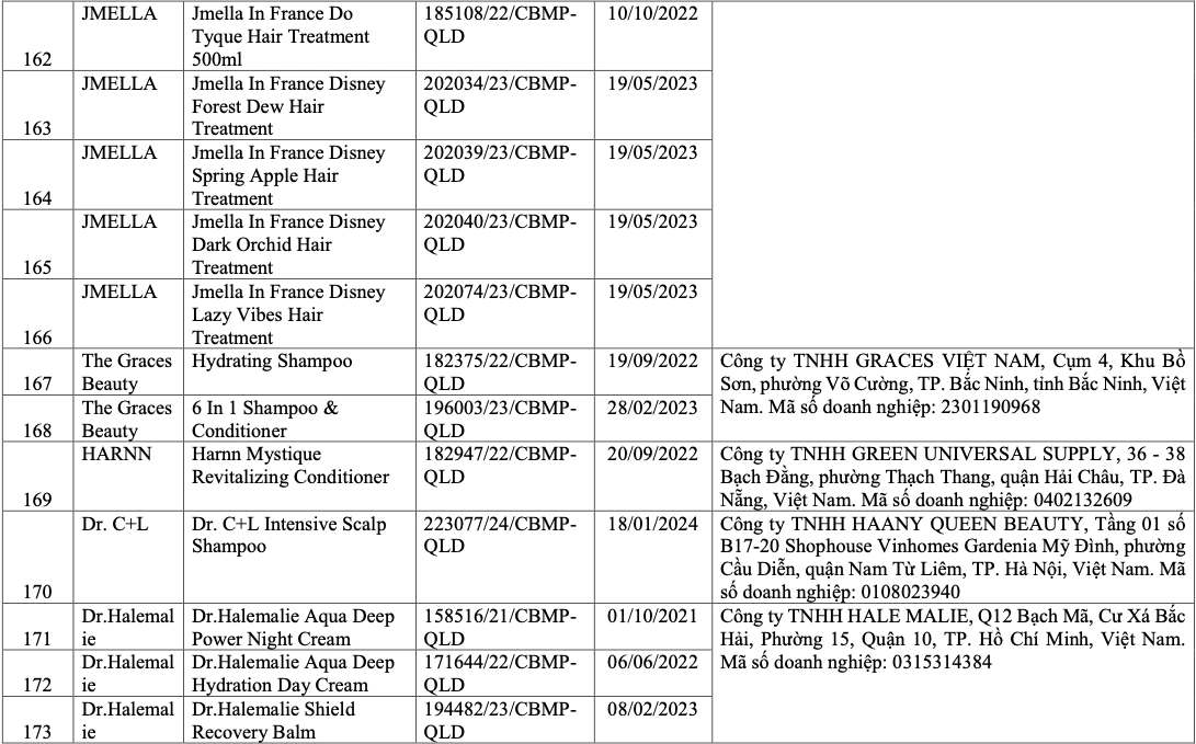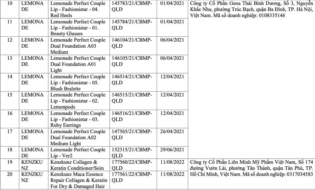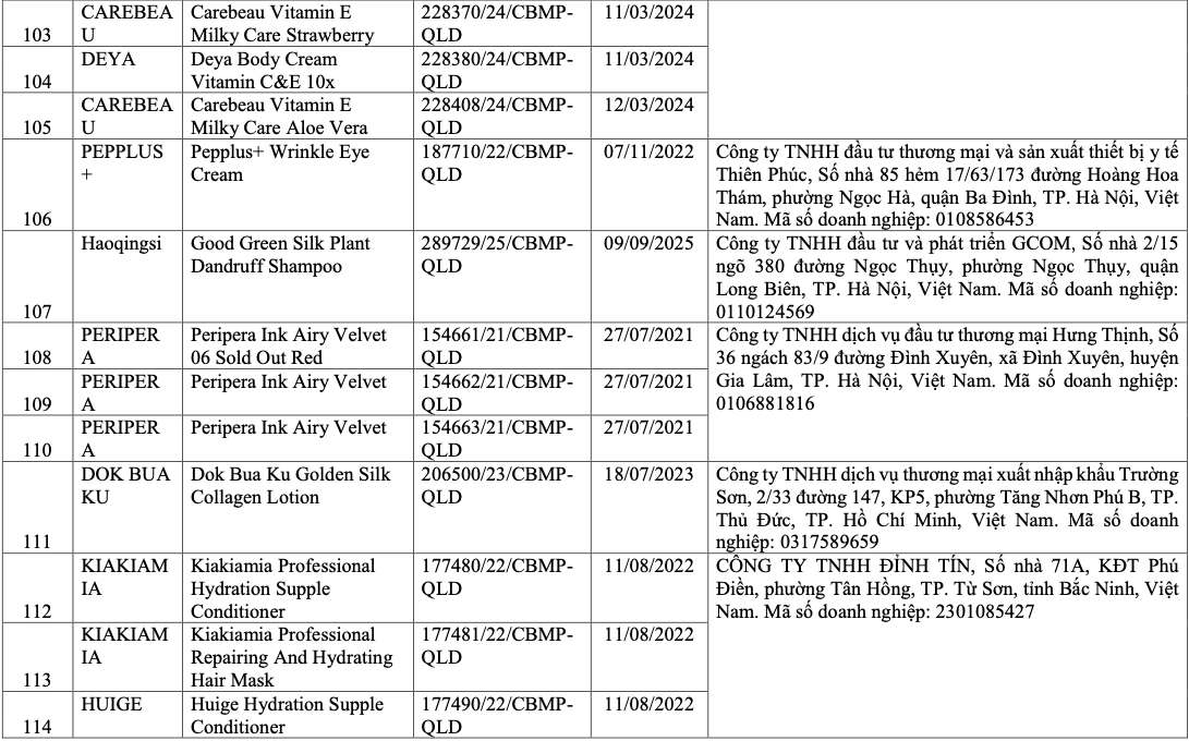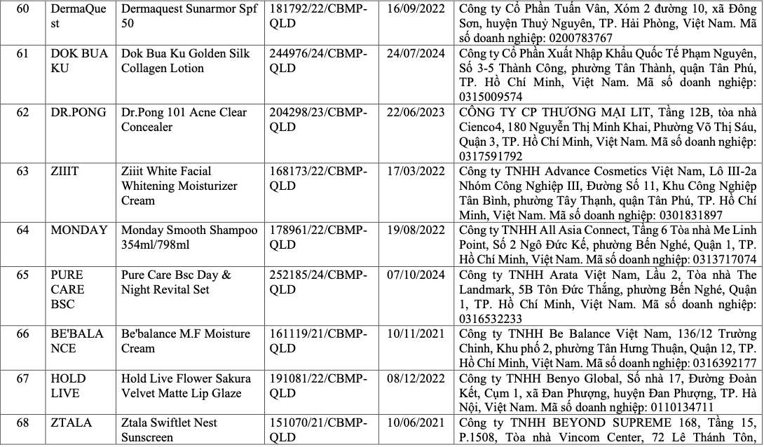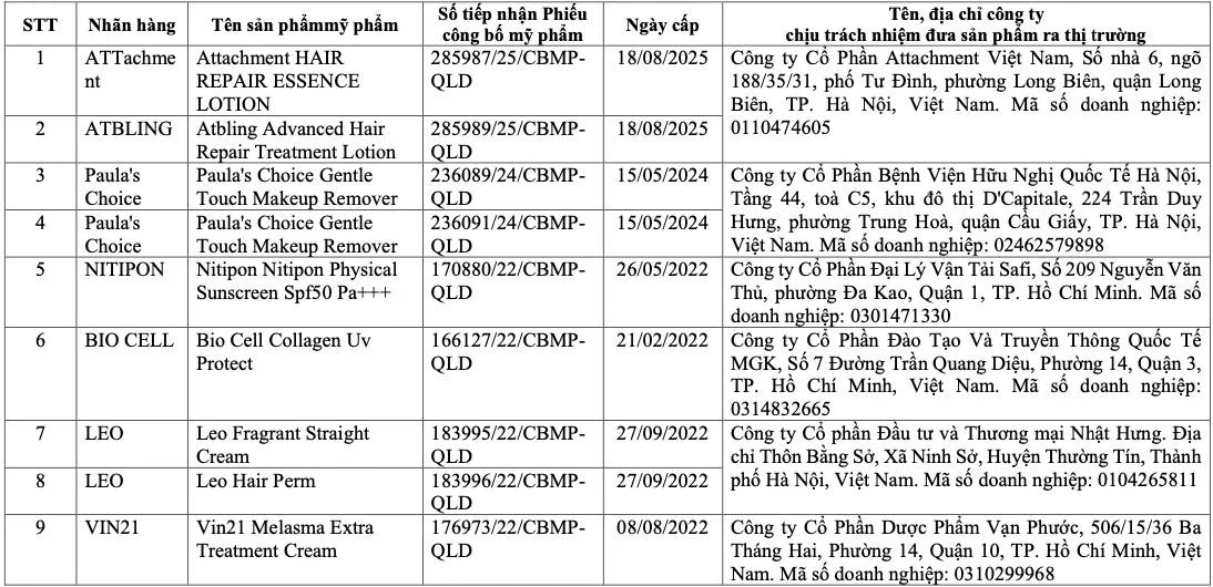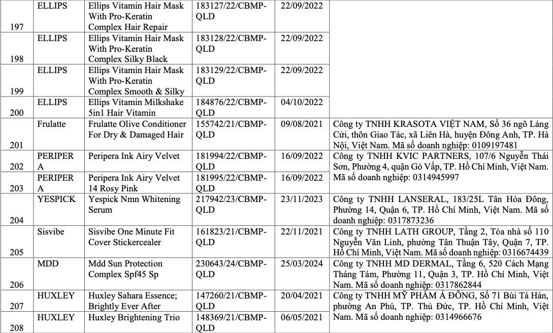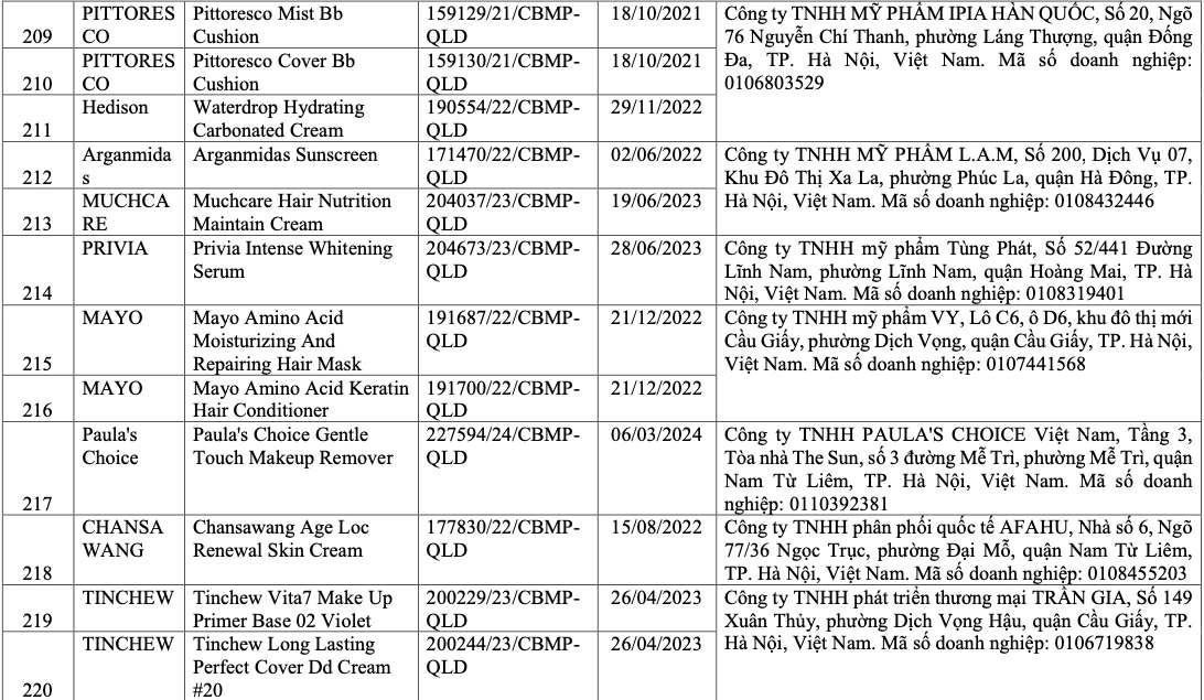 Danh sách do Cục Quản lý Dược công bố bao gồm 291 sản phẩm thuộc nhiều thương hiệu trong và ngoài nước. Một số sản phẩm được nêu như Paula’s Choice Gentle Touch Makeup Remover, Nitipon Physical Sunscreen SPF50 PA+++,.. Nhóm sản phẩm tóc và chăm sóc tóc chiếm số lượng lớn với các tên như Attachment Hair Repair Essence Lotion,...