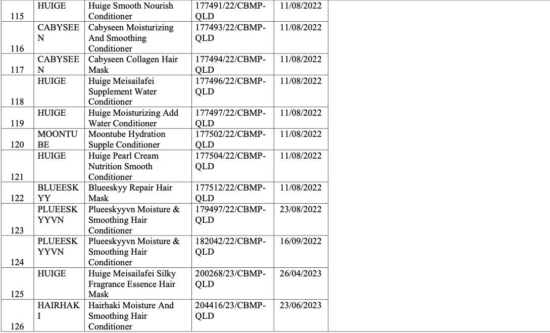 Các sản phẩm bị thu hồi thuộc nhiều nhóm, từ chăm sóc da, trang điểm đến chăm sóc tóc. Danh mục có một số sản phẩm như Paula's Choice Gentle Touch Makeup Remover, Nitipon Physical Sunscreen SPF50 PA+++. Trong đó, nhóm sản phẩm chăm sóc tóc chiếm số lượng lớn, với các tên như Attachment Hair Repair Essence Lotion…