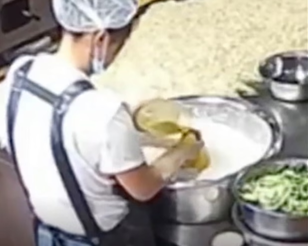 Camera quay lại cảnh nhân viên nhà bếp dùng bột màu công nghiệp để pha vào bột mì