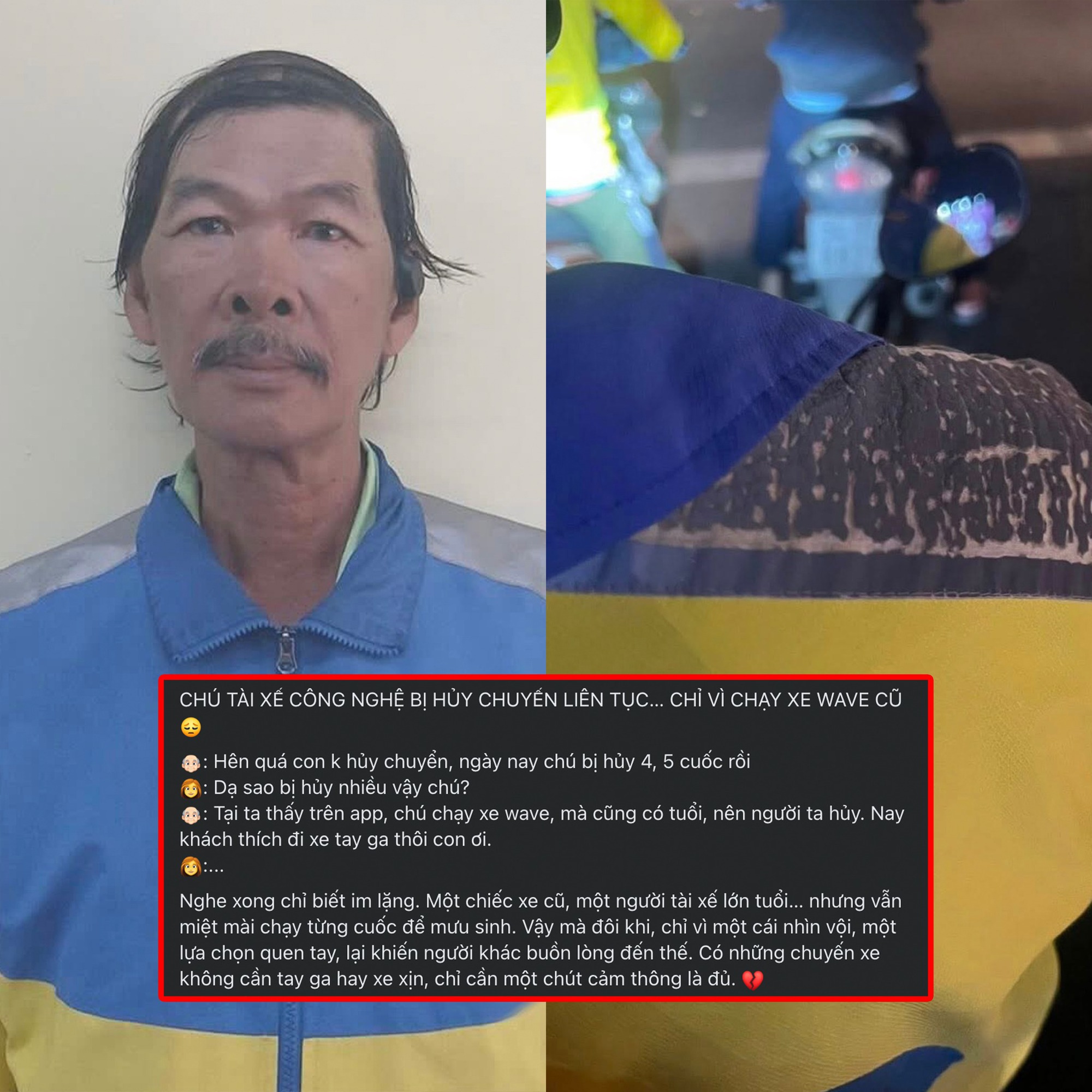 Trong bài đăng trên mạng xã hội cho biết, người tài xế xe ôm công nghệ khoảng 60 tuổi liên tục bị hủy chuyến do đi xe máy Wave cũ. Người tài xế tâm sự rằng: "Hên quá con không hủy chuyến, ngày nay chú bị hủy 4-5 cuốc rồi". Khi được hỏi sao lại bị hủy nhiều như vậy, ông đáp: "Tại người ta thấy trên ứng dụng chú chạy xe Wave, mà cũng có tuổi, nên người ta hủy. Nay khách thích đi xe máy tay gas thôi con ơi".