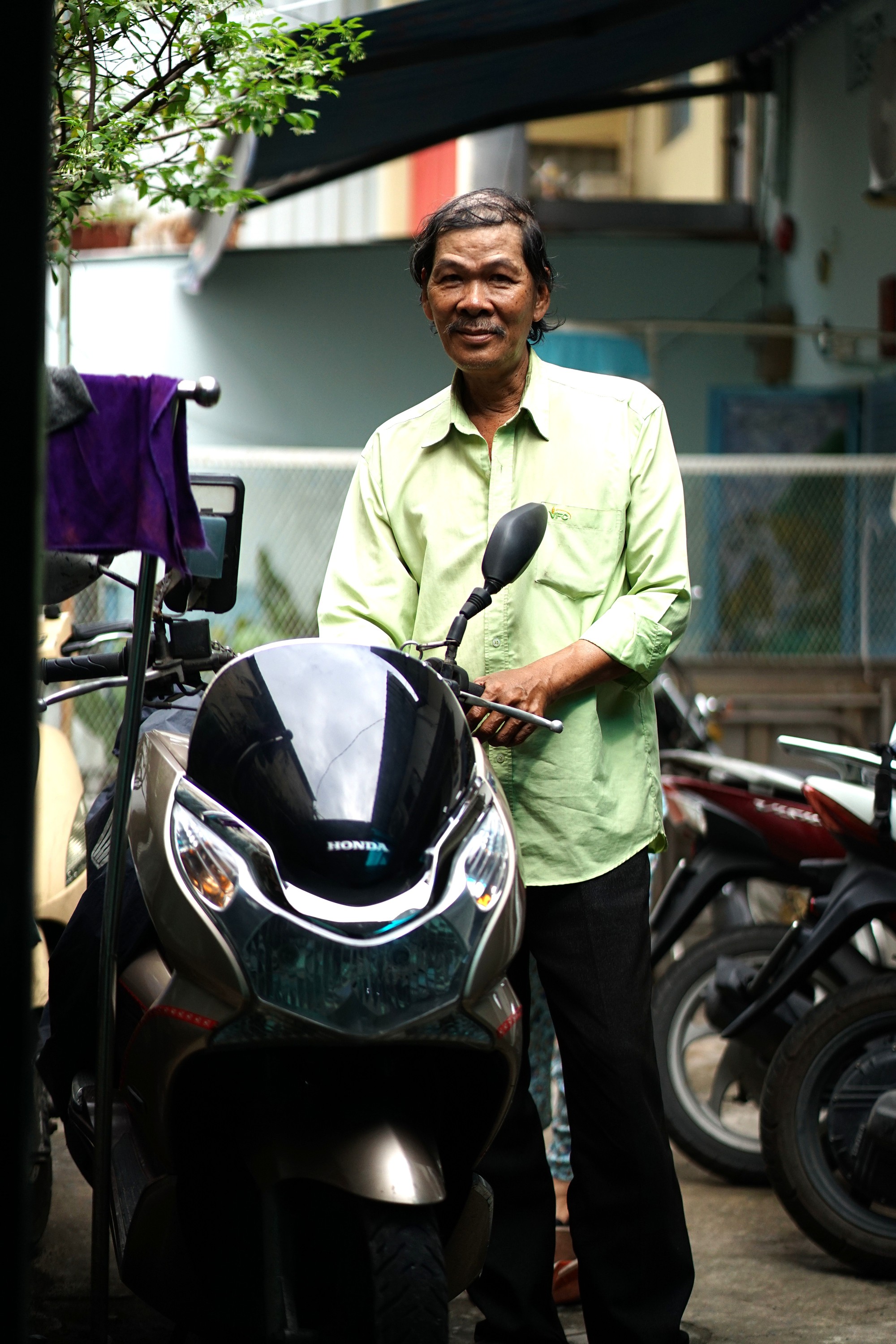 Chú Sơn đứng cạnh chiếc PCX được chú sử dụng làm phương tiện chạy xe ôm công nghệ chở khách mỗi ngày