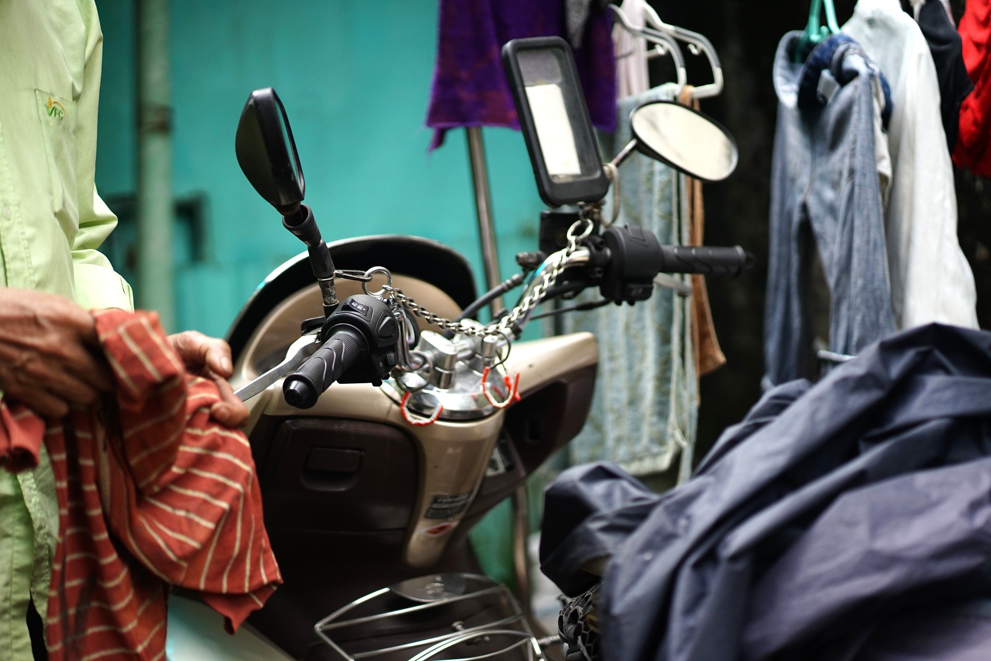Một chiếc xe máy tay ga khác đang được chú Sơn dựng ở góc nhà
