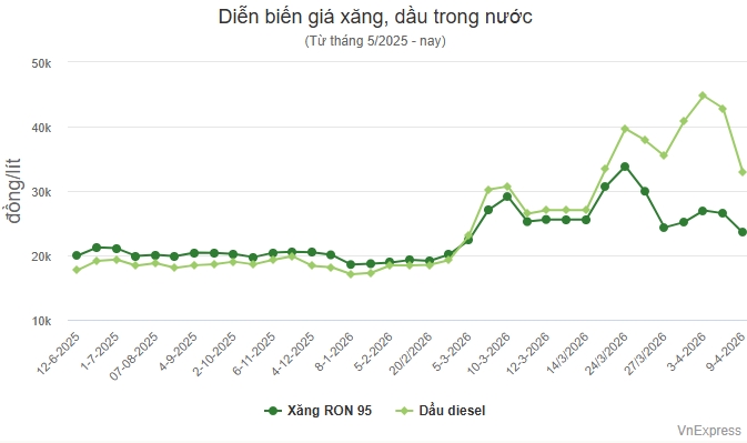 Chiều ngày 9/4/2026, báo VnExpress đưa tin: "Giá dầu diesel hạ gần 10.000 đồng một lít", cập nhật tình hình xăng dầu mới nhất như sau: