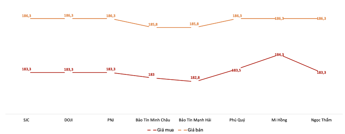 Tại Bảo Tín Minh Châu và Bảo Tín Mạnh Hải, giá vàng miếng SJC giảm 1,4 triệu đồng/lượng mỗi chiều, đặt giá giao dịch ở mức 182,8 triệu – 185,8 triệu đồng/lượng ngay khi mở cửa. Cả hai thương hiệu này giữ nguyên mức giá giao dịch trên trong suốt phiên sáng.