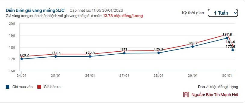 Biến động giá vàng SJC trong nước trong 1 tuần qua.