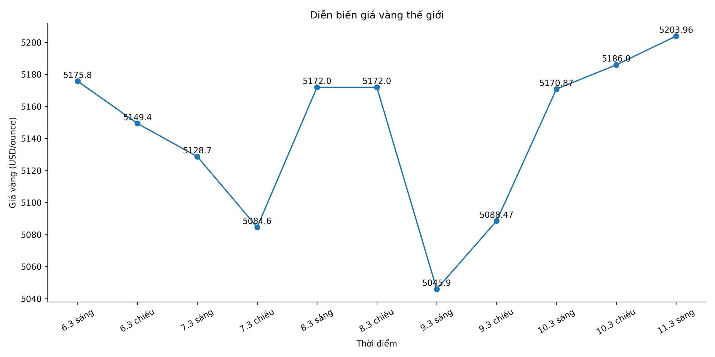 Diễn biến tăng của thị trường trong nước chủ yếu chịu tác động từ đà đi lên của giá vàng thế giới. Trên thị trường quốc tế, giá vàng giao dịch quanh mức 5.215 USD/ounce, tăng khoảng 25 USD/ounce so với đầu phiên sáng và tăng khoảng 40 USD/ounce so với phiên trước.