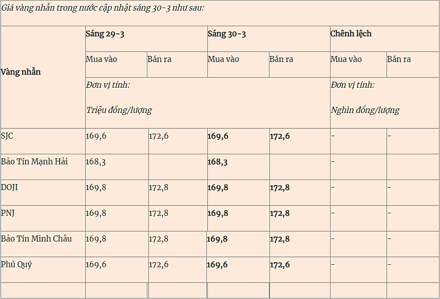 Cập nhật giá vàng trong nước mới nhất, báo Quân đội nhân dân ngày 30/3/2026 đăng tin: "Giá vàng hôm nay (30-3): Neo cao", nội dung chính cho biết: