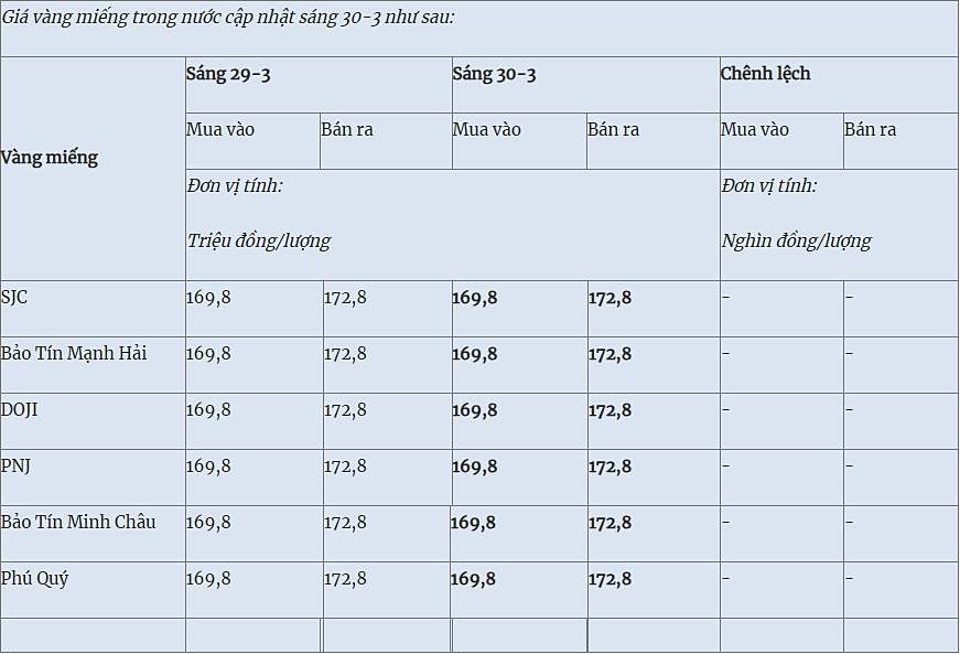 Các thương hiệu SJC, Bảo Tín Mạnh Hải, PNJ, Bảo Tín Minh Châu, Phú Quý cùng giao dịch vàng miếng ở mức 169,8 – 172,8 triệu đồng/lượng (mua vào – bán ra), đi ngang so với hôm qua. Tuy nhiên, so với chốt phiên tuần trước, giá vàng miếng đã tăng thêm 1,8 triệu đồng/lượng cả hai chiều mua vào và bán ra.