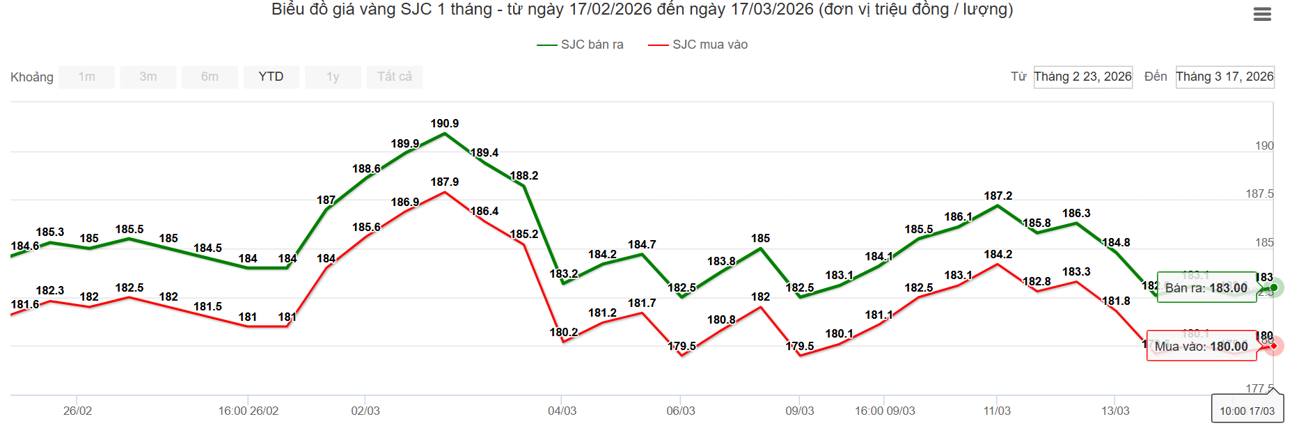 Diễn biến giá vàng SJC từ ngày 17/2 - 17/3/2026