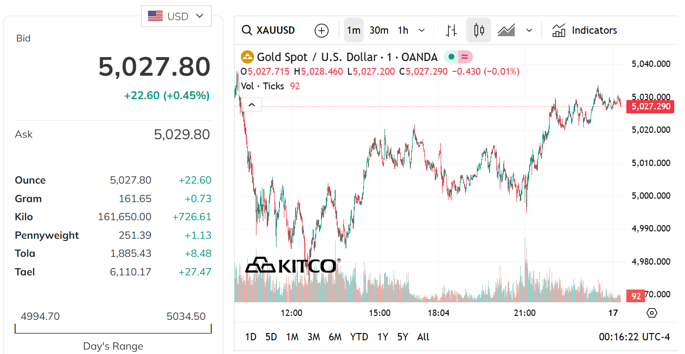 Giá vàng tiếp tục giao dịch trong một kênh thu hẹp gần mức hỗ trợ 5.000 đô la vào thứ Ba, với giá vàng giao ngay cuối phiên ở mức 5.010,42 đô la/ounce, tăng nhẹ 0,08% so với phiên trước đó.