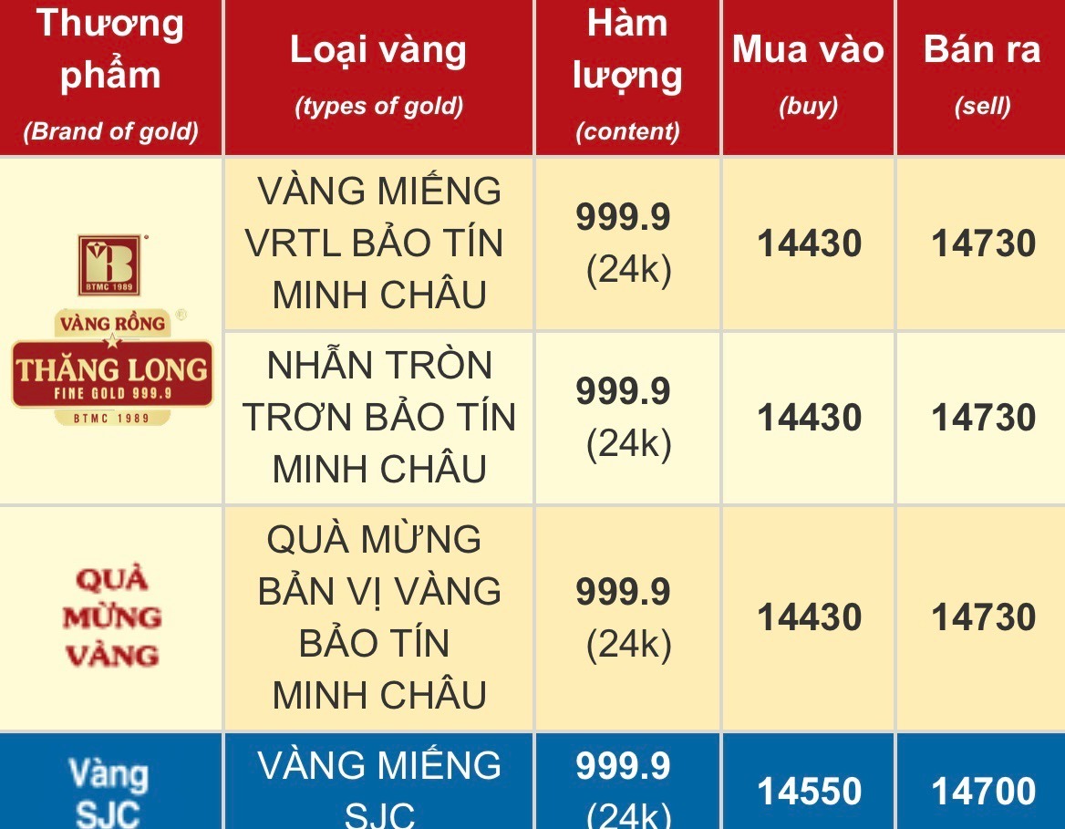 Bảo Tín Minh Châu niêm yết giá vàng nhẫn ở ngưỡng 144,3-147,3 triệu đồng/lượng (mua vào - bán ra).