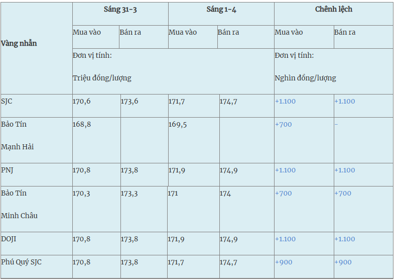 Lúc 6h ngày 1/4, giá vàng miếng tại Doji và SJC được niêm yết ở mức 171,9 triệu đồng/lượng (mua) - 174,9 triệu đồng/lượng (bán), tăng 1,1 triệu đồng/lượng so với phiên giao dịch trước.