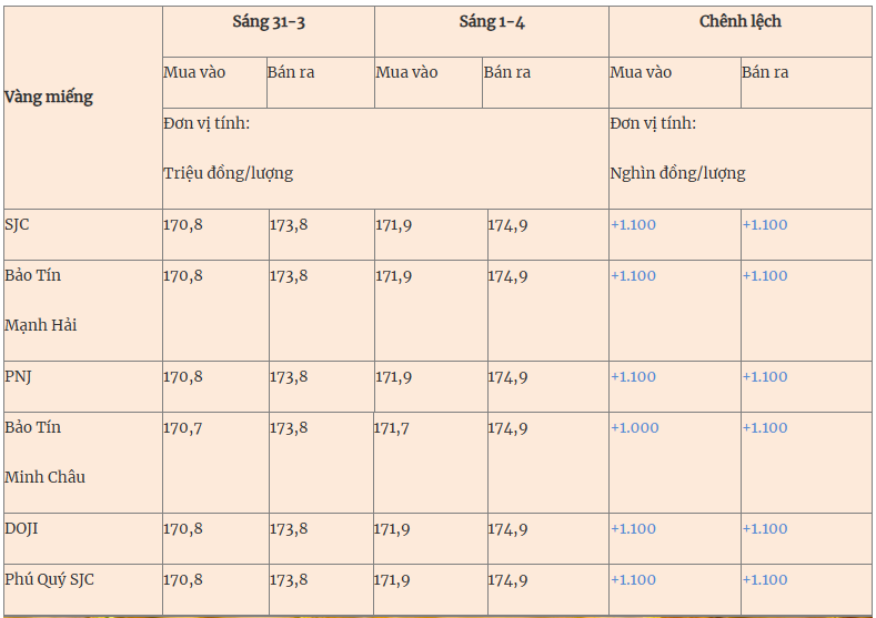 Giá vàng miếng trong nước cập nhật sáng 1-4 như sau: