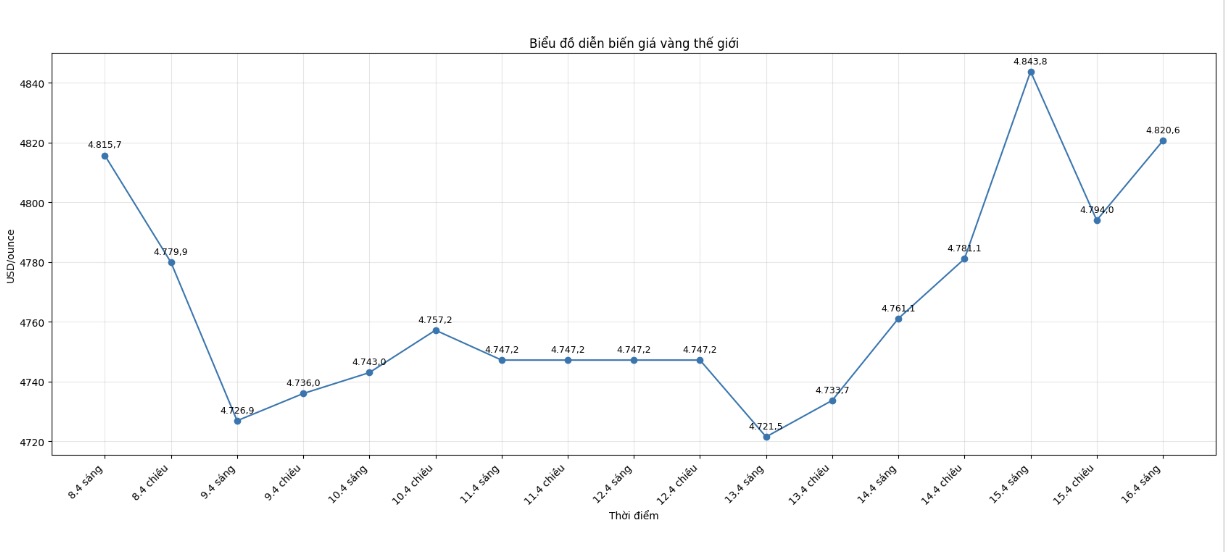 Sáng ngày 16/4, lúc 6h51, giá vàng lại tăng lên 4.825 USD/ounce. Chênh lệch giữa giá vàng trong nước và thế giới thu hẹp còn khoảng 20 triệu đồng/lượng.