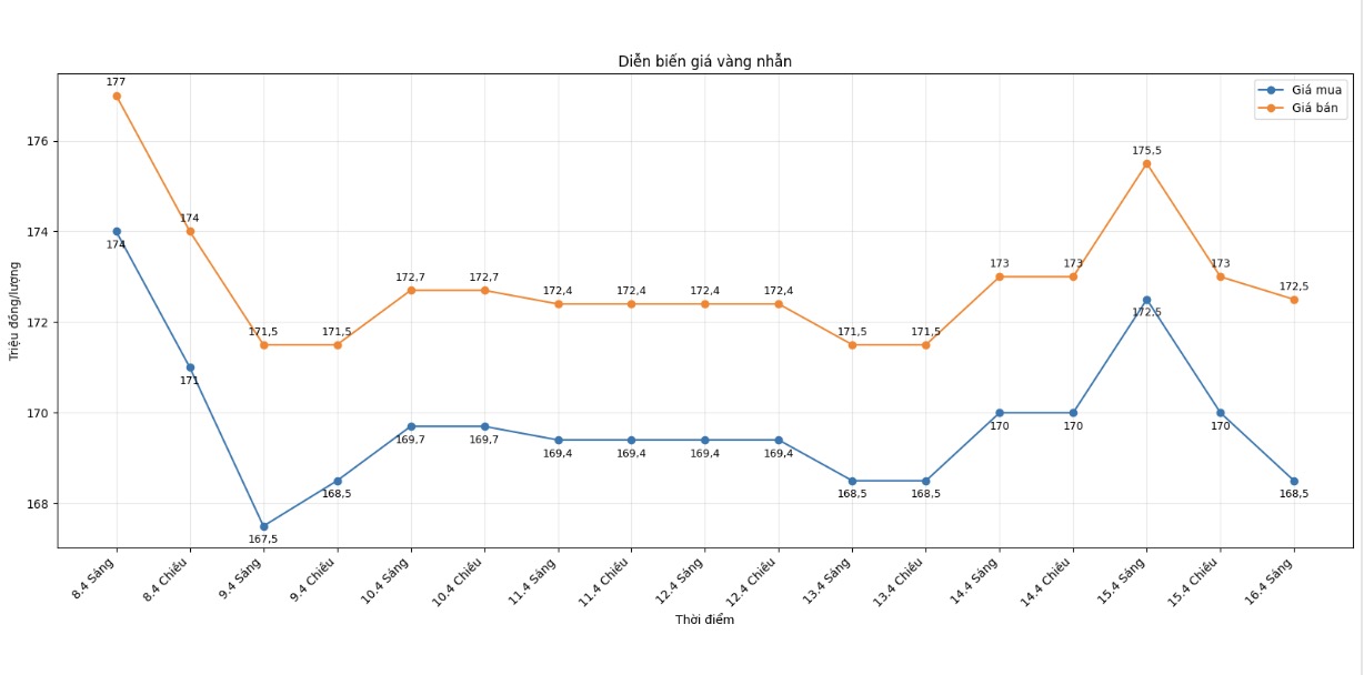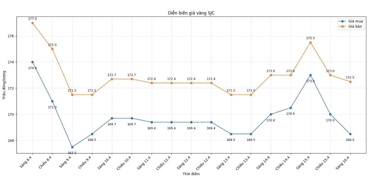 Mở cửa phiên giao dịch ngày 16/4, lúc 8h34, giá vàng miếng SJC được điều chỉnh giảm 1,5 triệu đồng mỗi lượng ở chiều mua và giảm 1 triệu đồng/lượng ở chiều bán so với mức kết hôm qua, niêm yết ở mức giá 168,5-172,5 triệu đồng/lượng (mua vào - bán ra).