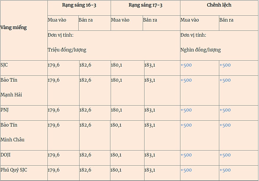 Giá vàng miếng trong nước cập nhật sáng 17-3 như sau: