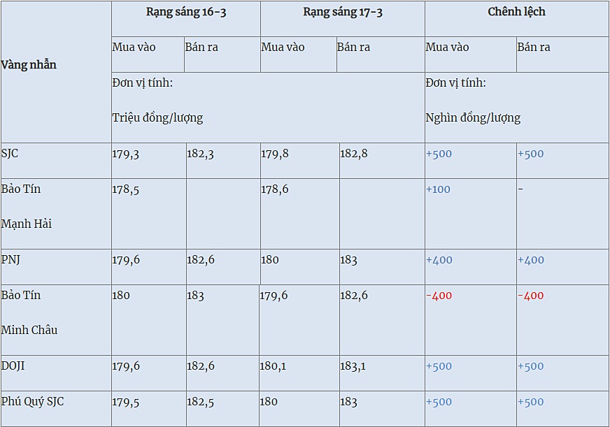 Giá vàng nhẫn trong nước hôm nay (17-3) cập nhật như sau: