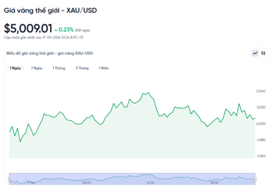 Theo dữ liệu từ Kitco và Trading Economics tính đến sáng ngày 18/03/2026, giá vàng giao ngay (spot gold) đang niêm yết quanh mức 5.001 USD/ounce. Trong phiên giao dịch đêm qua, đã có thời điểm vàng bứt phá lên mức cao nhất là 5.044 USD/ounce trước khi quay đầu điều chỉnh giảm khoảng 43 USD về vùng giá hiện tại.
