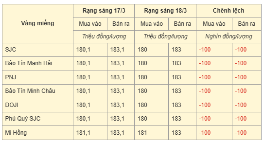 Cụ thể, giá vàng miếng SJC tại SJC, Tập đoàn DOJI, PNJ, Phú Quý, Bảo Tín Minh Châu và Bảo Tín Mạnh Hải cùng niêm yết ở ngưỡng 180-183 triệu đồng/lượng, giảm 100.000 đồng/lượng ở cả hai chiều so với cùng kỳ hôm qua. Chênh lệch giá vàng ở mức 3 triệu đồng.