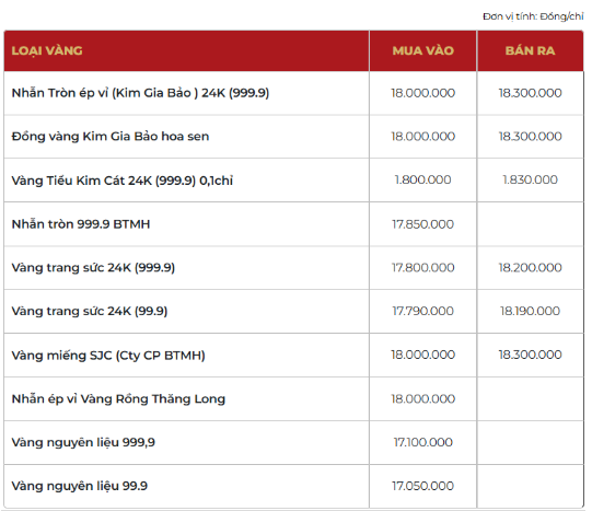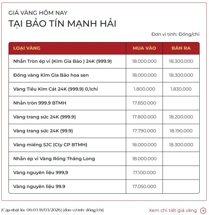 Giá vàng thương hiệu Bảo Tín Mạnh Hải được niêm yết sáng sớm ngày 18/03/2026.