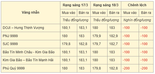 Giá vàng nhẫn trong nước cập nhật sáng 18/3 như sau: