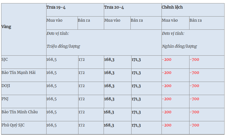 Tiếp đến, báo Quân Đội Nhân Dân thông tin thêm trong bài viết: "Giá vàng hôm nay (trưa 20-4): Đồng loạt giảm" cụ thể như sau:
