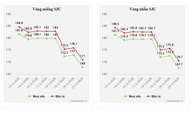 Trong phiên giao dịch cuối tuần trước (ngày 21/3), giá vàng miếng SJC niêm yết ở mức 168-171 triệu đồng/lượng (mua – bán), giảm tới 5,1 triệu đồng/lượng ở cả hai chiều so với phiên trước.