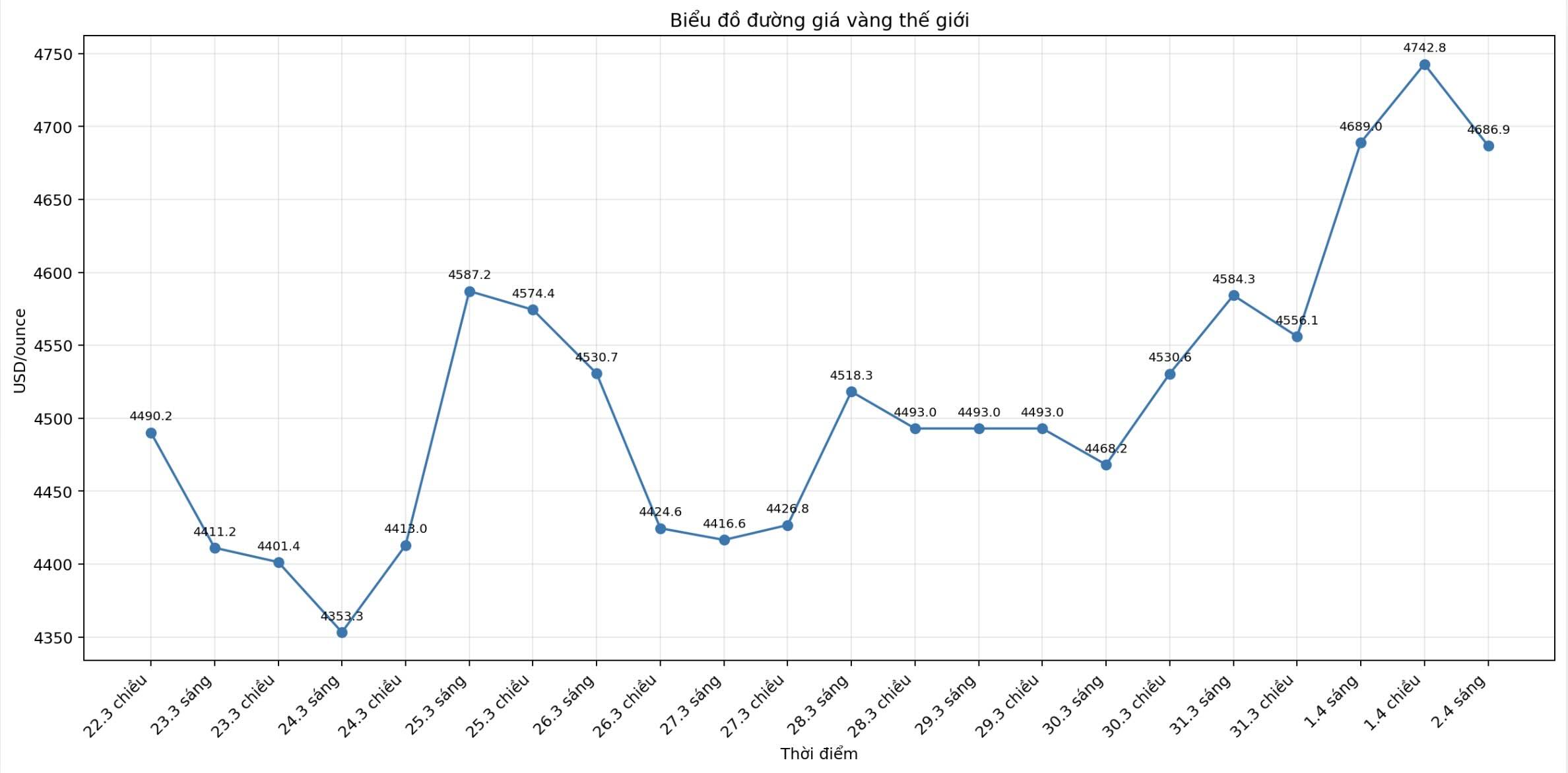 Lúc 9h15, giá vàng thế giới niêm yết quanh ngưỡng 4.686,9 USD/ounce, giảm 2,1 USD so với một ngày trước.