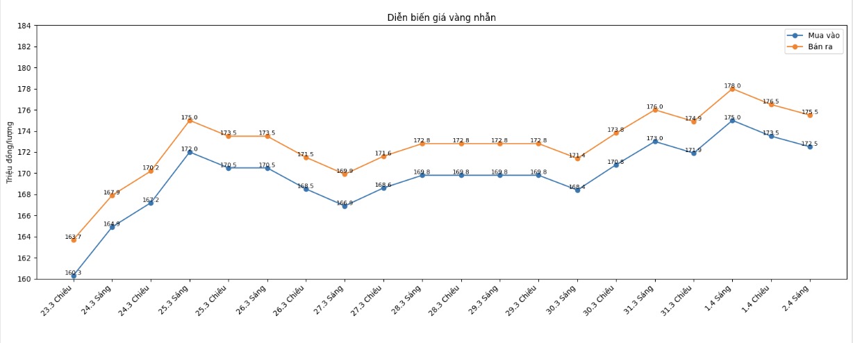 Mở cửa phiên giao dịch ngày 2/4, giá vàng miếng SJC được điều chỉnh giảm 1,2 triệu đồng/lượng ở cả chiều mua và bán so với kết phiên hôm qua, xuống mức 172,5-175,5 triệu đồng/lượng (mua vào - bán ra). Giá vàng nhẫn SJC cũng giảm 1,2 triệu đồng/lượng, giao dịch ở mức 172,3-175,3 triệu đồng/lượng (mua - bán).