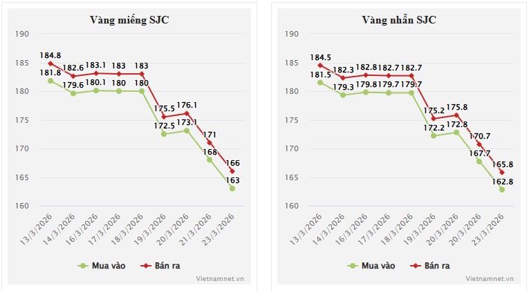 Chốt phiên giao dịch ngày 23/3, giá vàng miếng SJC niêm yết ở mức 163–166 triệu đồng/lượng (mua – bán), giảm 5 triệu đồng/lượng so với cuối tuần trước.