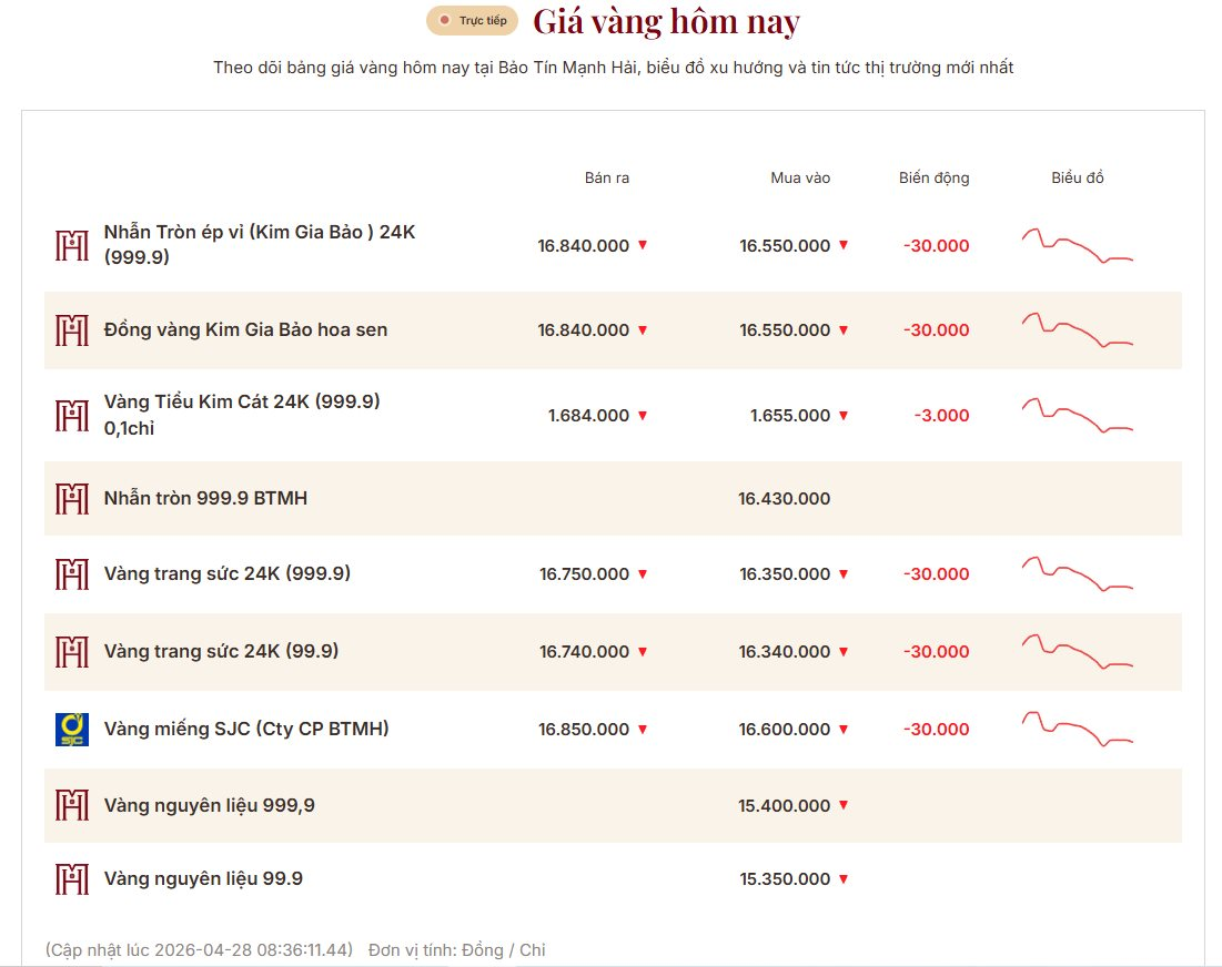 Ngày 28/4/2026, trang Nhịp Sống Thị Trường đăng tải bài viết: "Giá vàng hôm nay 28/4: Vàng nhẫn và SJC đồng loạt lao dốc" có nội dung như sau: