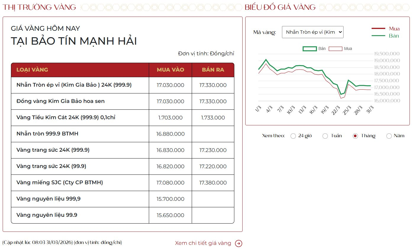Giá vàng hôm nay 31/3 ghi nhận đà tăng trưởng cực kỳ mạnh mẽ tại các hệ thống kinh doanh lớn như Bảo Tín Mạnh Hải, Phú Quý, Bảo Tín Minh Châu và SJC.