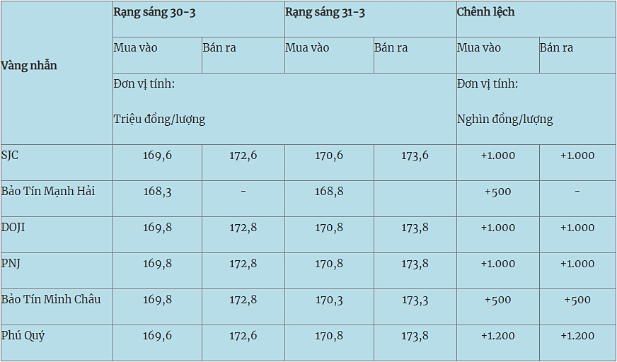 Giá vàng miếng trong nước cập nhật sáng 31-3 như sau: