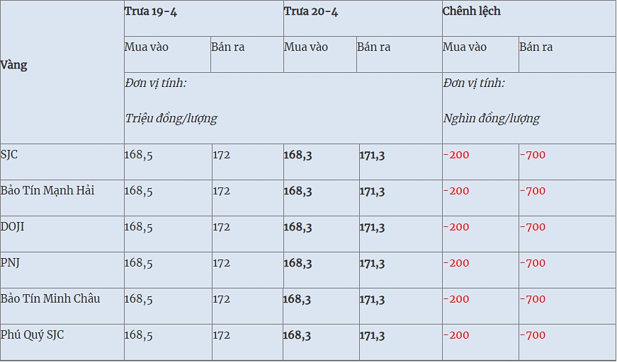 Giá vàng hôm nay: Trưa 20-4, giá vàng miếng SJC được các thương hiệu niêm yết ở mức 168,3 triệu đồng/lượng mua vào và 171,3 triệu đồng/lượng bán ra, giảm 700.000 đồng/lượng chiều bán ra.