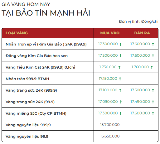 Bảo Tín Minh Châu cũng nâng giá vàng miếng lên 173 – 176 triệu đồng/lượng, tăng lần lượt 2,3 triệu đồng/lượng ở chiều mua và 2,2 triệu đồng/lượng ở chiều bán. Trong khi đó, Mi Hồng niêm yết vàng miếng ở mức 173,5 – 176 triệu đồng/lượng, tăng 2,2 triệu đồng/lượng chiều mua và 2,2 triệu đồng/lượng chiều bán.
