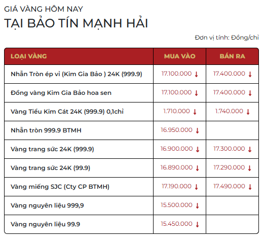 Bảo Tín Minh Châu hiện niêm yết vàng miếng ở mức 171,7 – 174,9 triệu đồng/lượng, giảm 1,3 triệu đồng/lượng chiều mua và 1,1 triệu đồng/lượng chiều bán so với đầu giờ sáng. Trong khi đó, Mi Hồng giảm xuống còn 172 – 174,5 triệu đồng/lượng, tương ứng giảm 1,5 triệu đồng/lượng chiều mua và 1,5 triệu đồng/lượng chiều bán.