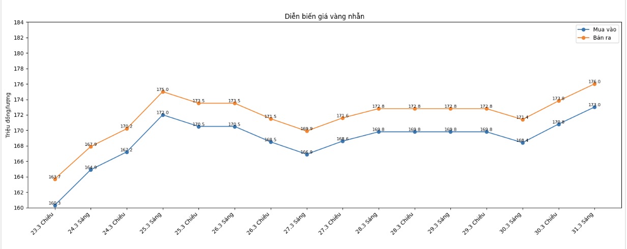 Cập nhật đầu giờ chiều ngày 31/3, giá vàng trong nước quay đầu giảm so với buổi sáng, nhưng vẫn duy trì cao hơn đáng kể so với chốt phiên trước đó.