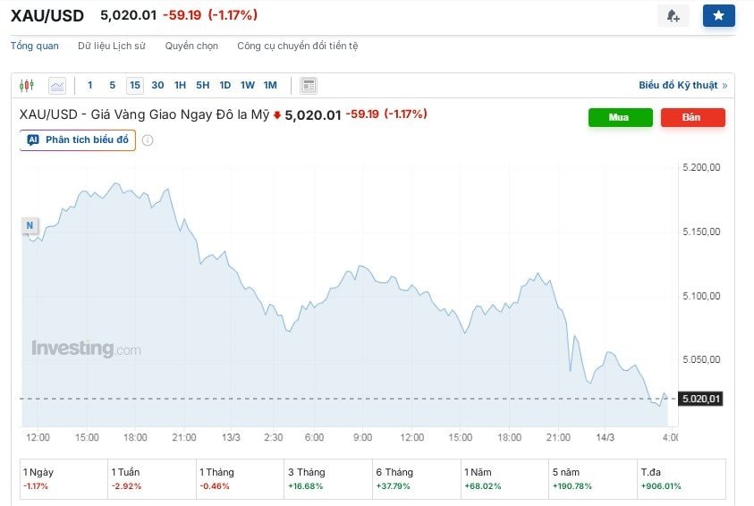 Tính đến đầu giờ sáng ngày 14/03/2026 (giờ Việt Nam), giá vàng thế giới giao ngay trên sàn Kitco đang niêm yết ở mức 5.042,9 USD/ounce, giảm mạnh hơn 35 USD so với cùng thời điểm ngày hôm trước. Trong phiên giao dịch, có thời điểm giá vàng đã xuyên thủng ngưỡng hỗ trợ tâm lý, rơi xuống mức thấp nhất là 5.037 USD/ounce trước khi có nhịp hồi nhẹ.