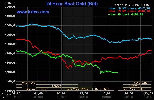 Chốt phiên giao dịch 20/3, giá vàng thế giới giao ngay giảm 157 USD (khoảng 3,4%) xuống 4.490 USD một ounce. Đây là phiên thứ 3 liên tiếp giá kim loại quý giảm với mức hơn 100 USD. Tổng cộng 3 phiên qua, giá sụt hơn 500 USD.