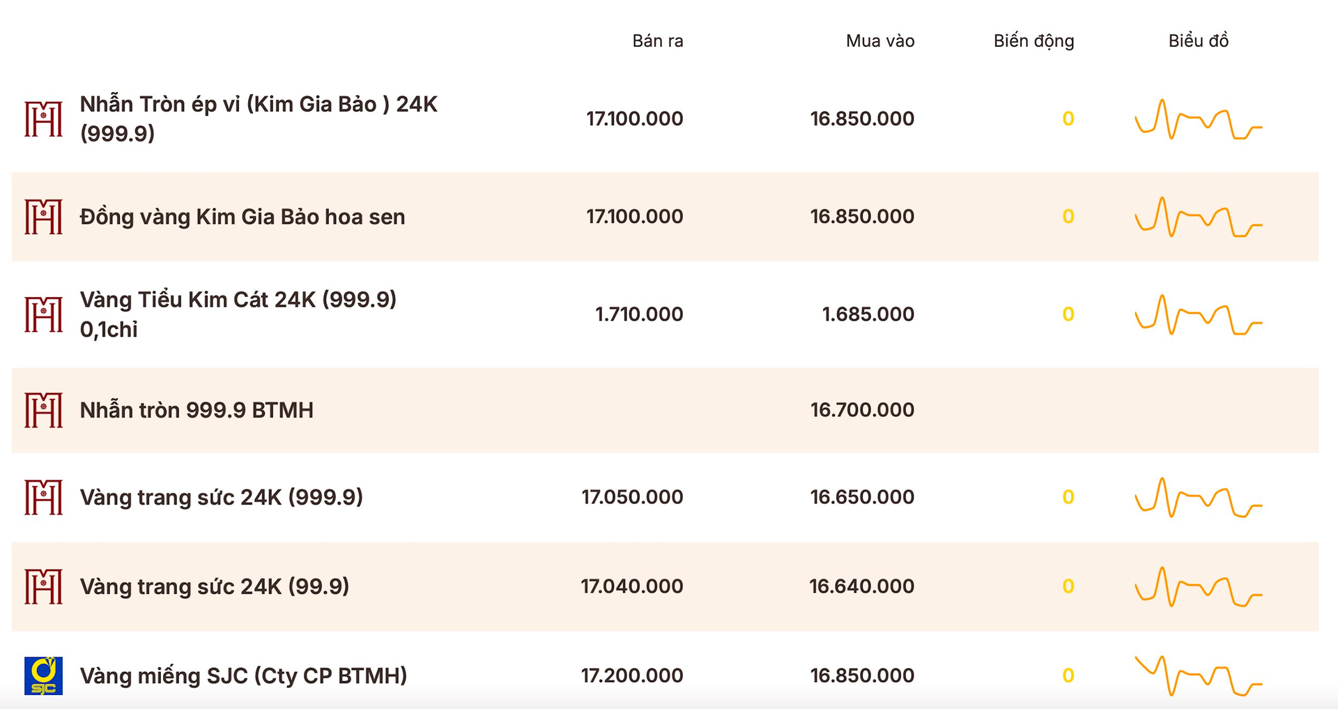 Vàng nhẫn PNJ, Phú Quý niêm yết ở mức 168 - 171 triệu đồng/lượng mua vào - bán ra (giảm 500.000 đồng/lượng ở cả hai chiều).