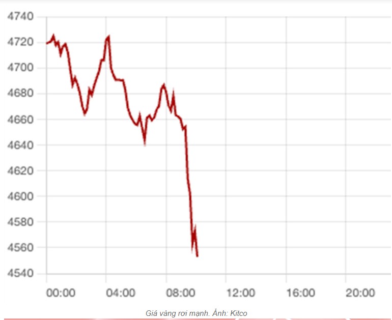 Đến 23h, giá vàng tiếp tục tuột dốc xuống 4.553 USD/ounce, giảm gần 100 USD.
