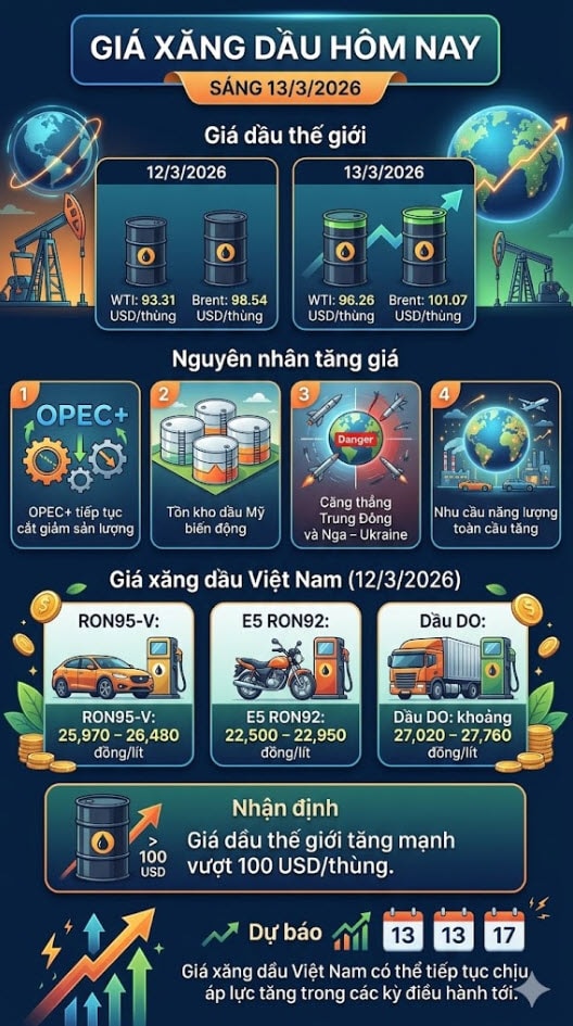Trên thị trường quốc tế, giá dầu thô tiếp tục tăng mạnh trong phiên giao dịch ngày 13/3/2026.